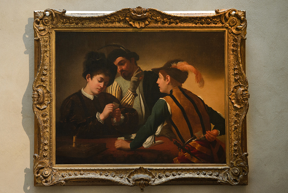 Caravaggio painted swiftly, with little preparatory work to the canvas and had a remarkable ability to capture a moment in time.. The second boy is the cardsharp, and he has extra cards tucked in his belt behind his back, out of sight, he also a dagger handy at his side. The stigmatization of saint francis; The decorous youth with his extravagantly feathered cap is in deliberate contrast to that of his opponent, whose chopped fringe and uncompromisingly thuggish appearance is characteristic of paolini's. The cardsharps, 1594 by caravaggio. The conversion of saint paul; Even the delicate red lake glazes over the vermilion red hearts on the cards are intact. The removal of the lining in the 1987 restoration uncovered a stamped seal on the reverse. Caravaggio painted swiftly, with little preparatory work to the canvas and had a remarkable ability to capture a moment in time.. Even the delicate red lake glazes over the vermilion red hearts on the cards are intact.